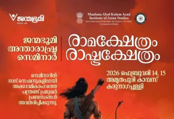കൊല്ലം: കരുനാഗപ്പള്ളി അമൃതപുരി കാമ്പസില് 14, 15 തീയതികളില് നടക്കുന്ന ‘രാമക്ഷേത്രം രാഷ്ട്രക്ഷേത്രം’ ജന്മഭൂമി അന്താരാഷ്ട്ര സെമിനാര് ലക്ഷ്യമിടുന്നത് വിപുലമായ സാംസ്കാരിക തീര്ത്ഥാടനം. രാജ്യത്ത് തെക്ക്, വടക്ക്...