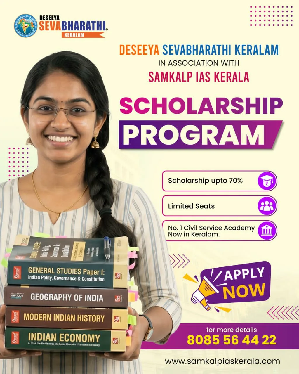 ദേശീയ സേവാഭാരതി കേരളവും SAMKALP IAS KERALA യും സഹകരിച്ച് ഡൽഹി ആസ്ഥാനമായി പ്രവർത്തിക്കുന്ന SAMKALP IAS ACADEMY യിൽ സിവിൽ സർവീസ് പ്രവേശന പരിശീലനത്തിന്, സ്കോളർഷിപ്പോടു കൂടി പഠിക്കുന്നതിനു, യോഗ്യരായവരിൽ നിന്ന് അപേക്ഷകൾ ക്ഷണിക്കുന്നു.70 ശതമാനം വരെ സ്കോളർഷിപ്പോടുകൂടി സിവിൽ സർവീസ് പരിശീലനത്തിന് പ്രവേശനം ലഭിക്കുവാൻ ഉടൻ തന്നെ രജിസ്റ്റർ ചെയ്യുക. കൂടുതൽ വിവരങ്ങൾക്ക് സന്ദർശിക്കുക www.samkalpiaskerala.com