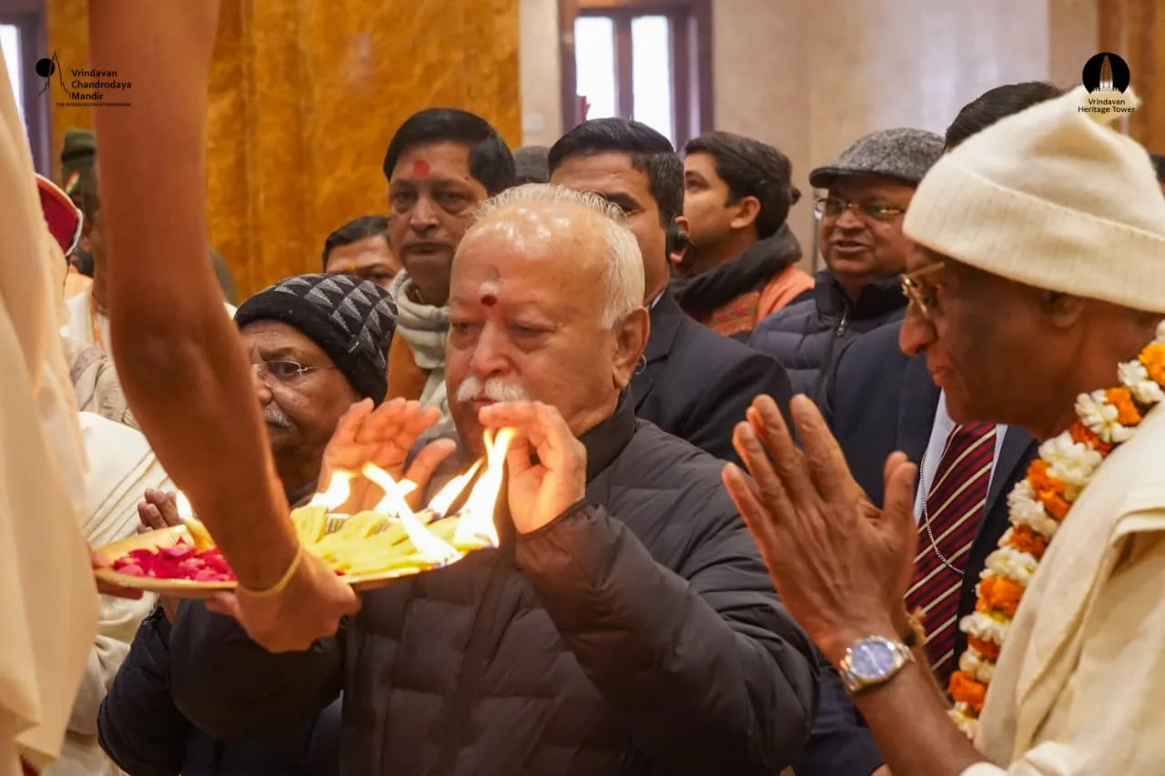ചന്ദ്രോദയ മന്ദിർ ഭാരവാഹികളായ ഭരതർഷഭ ദാസ്, മധു പണ്ഡിറ്റ് ദാസ്, ചഞ്ചലപതി ദാസ് എന്നിവർ ചേർന്ന് സർസംഘചാലകനെ സ്വീകരിച്ചു.