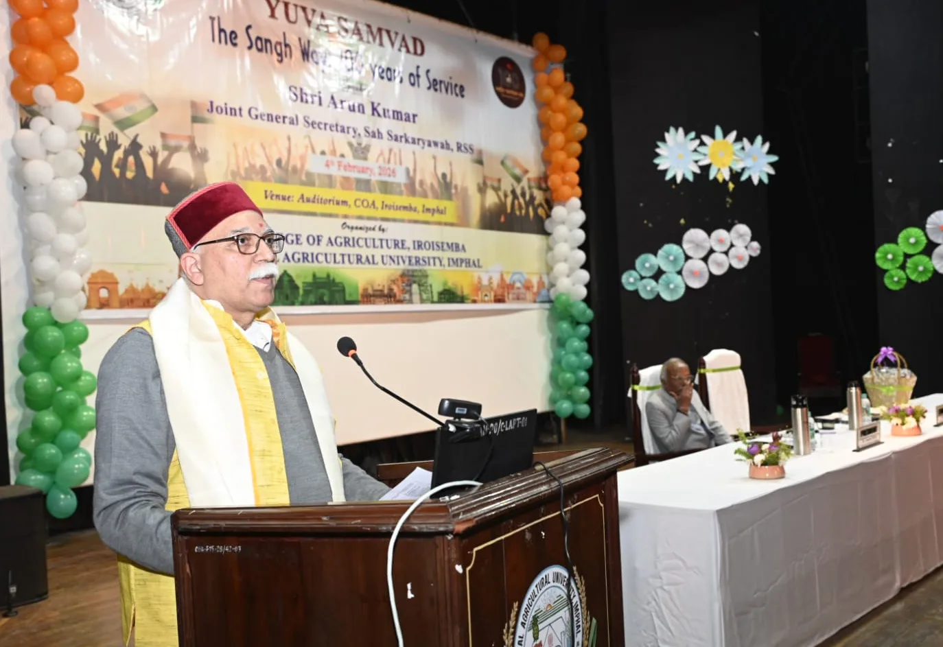 ഇറോയിസെംബയിലെ കാര്‍ഷിക കോളേജിന്റെ ഓഡിറ്റോറിയത്തില്‍ ”സംഘവഴി: സേവനത്തിന്റെ 100 വര്‍ഷങ്ങള്‍” എന്ന വിഷയത്തില്‍ സംഘടിപ്പിച്ച യുവ സംവാദ് (യുവജന ഇടപെടല്‍) പരിപാടിയെ അഭിസംബോധന ചെയ്യുകയായിരുന്നു അദ്ദേഹം.