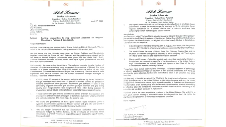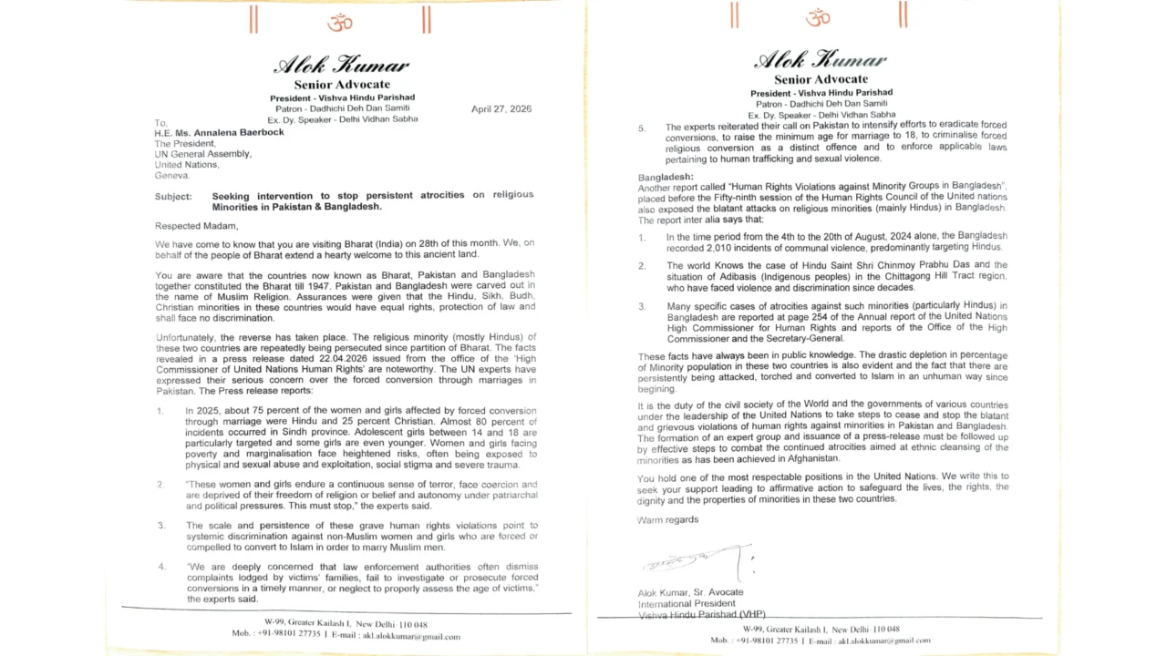 ബംഗ്ലാദേശില് ഹിന്ദുക്കളടക്കമുള്ള മതന്യൂനപക്ഷങ്ങളോടുള്ള അക്രമങ്ങള് അവസാനമില്ലാതെ തുടരുകയാണ്. ഗുരുതരമായ മനുഷ്യാവകാശ ലംഘനങ്ങള് തടയുന്നതിന് ഫലപ്രദമായ നടപടികള് സ്വീകരിക്കേണ്ട ഉത്തരവാദിത്തം ഐക്യരാഷ്ട്രസഭയ്ക്കുണ്ട്, കത്തില് ആലോക് കുമാര് ചൂണ്ടിക്കാട്ടി. കത്തിന്റെ ഒരു പകര്പ്പ് യുഎന് സെക്രട്ടറി ജനറലിനും പ്രധാനമന്ത്രി നരേന്ദ്ര മോദിക്കും വിദേശകാര്യ മന്ത്രി എസ്. ജയശങ്കറിനും അയച്ചിട്ടുണ്ട്.