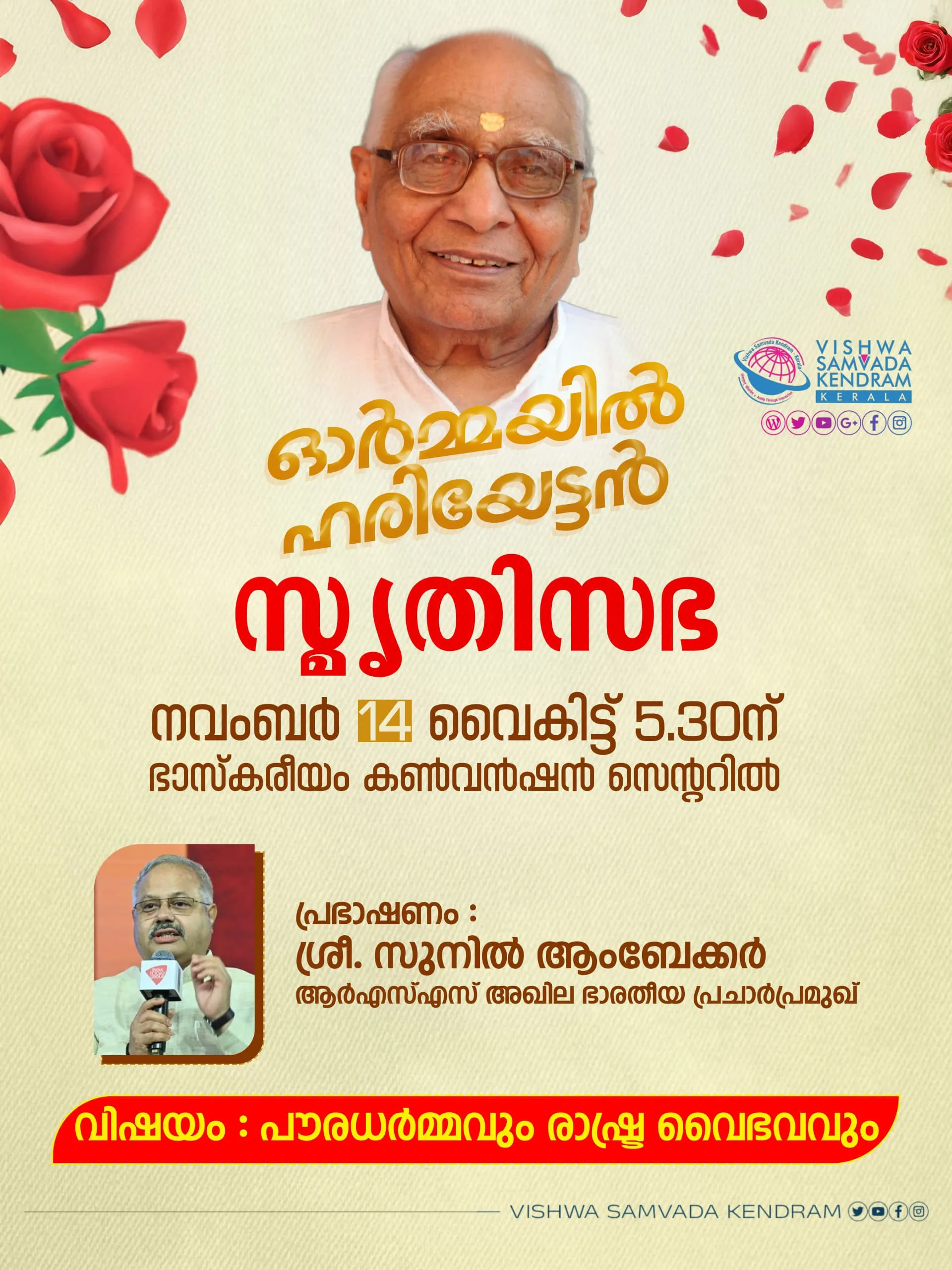 തിരുവനന്തപുരം: മുതിർന്ന രാഷ്ട്രീയ സ്വയംസേവക സംഘത്തിന്റെ (ആർഎസ്എസ്) പ്രചാരകനും സൈദ്ധാന്തികനും എഴുത്തുകാരനുമായ ഹരിയേട്ടൻ എന്ന് അറിയപ്പെട്ടിരുന്ന ആർ. ഹരിയുടെ രണ്ടാമത് ചരമവാർഷിക ദിനമാണിന്ന്. നവംബർ 14ന് ആർഎസ്എസ് അഖില ഭാരതീയ പ്രചാർ പ്രമുഖ് സുനിൽ ആംബേക്കർ മുഖ്യപ്രഭാഷണം നടത്തുന്ന സ്മൃതി സഭ എറണാകുളം ഭാസ്കരീയം കൺവൻഷൻ സെന്ററിൽ നടക്കും. വൈകിട്ട് 5.30 നാണ് പരിപാടി. ചിന്തകൻ, പ്രഭാഷകൻ, എഴുത്തുകാരൻ, സംഘാടകൻ എന്നിങ്ങനെ വിശേഷങ്ങൾ ഏറെയുള്ള രംഗഹരിയുടെ ആർഎസ്എസ് പ്രവർത്തന കാലം സുദീർഘമാണ്.
