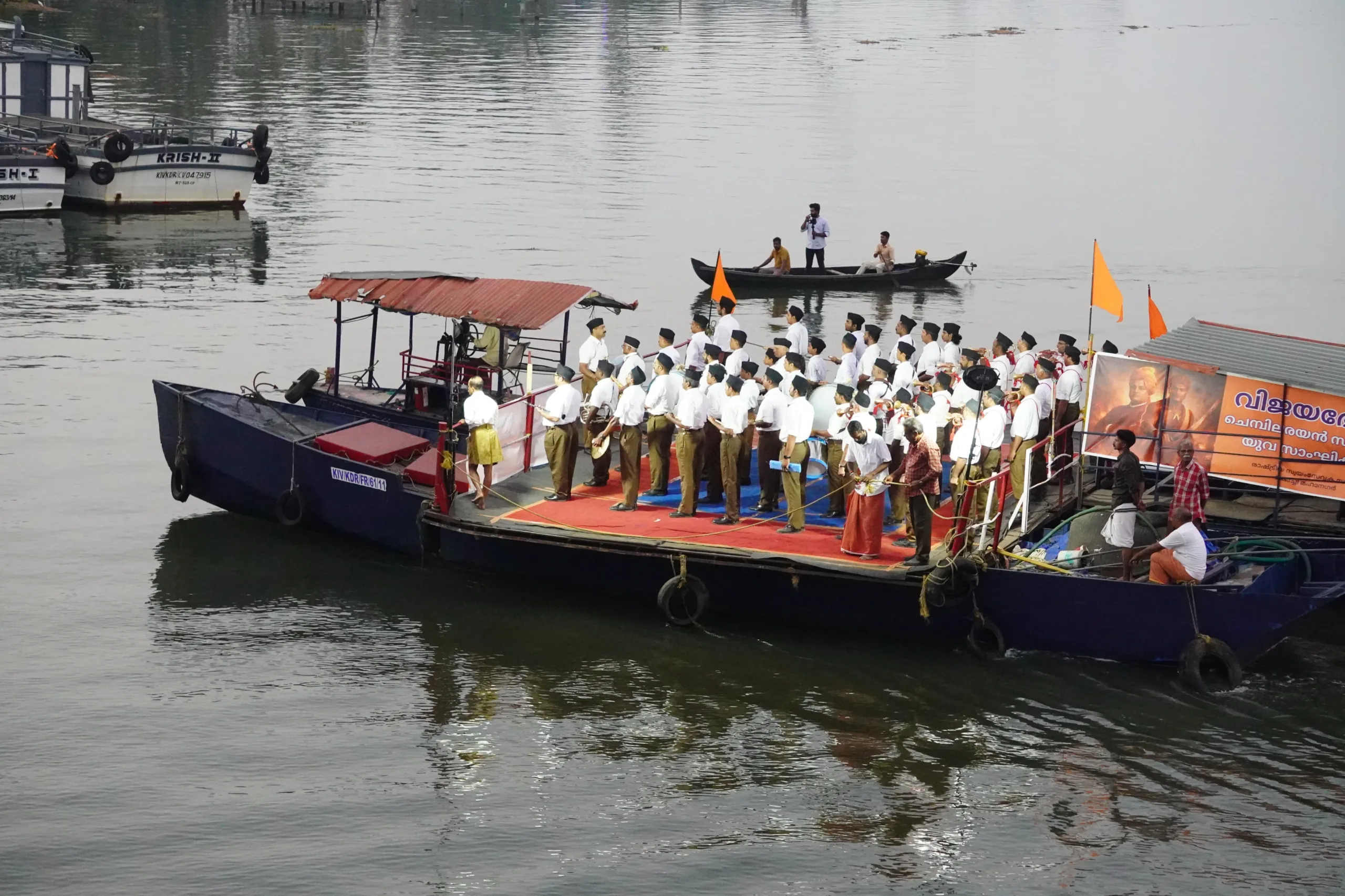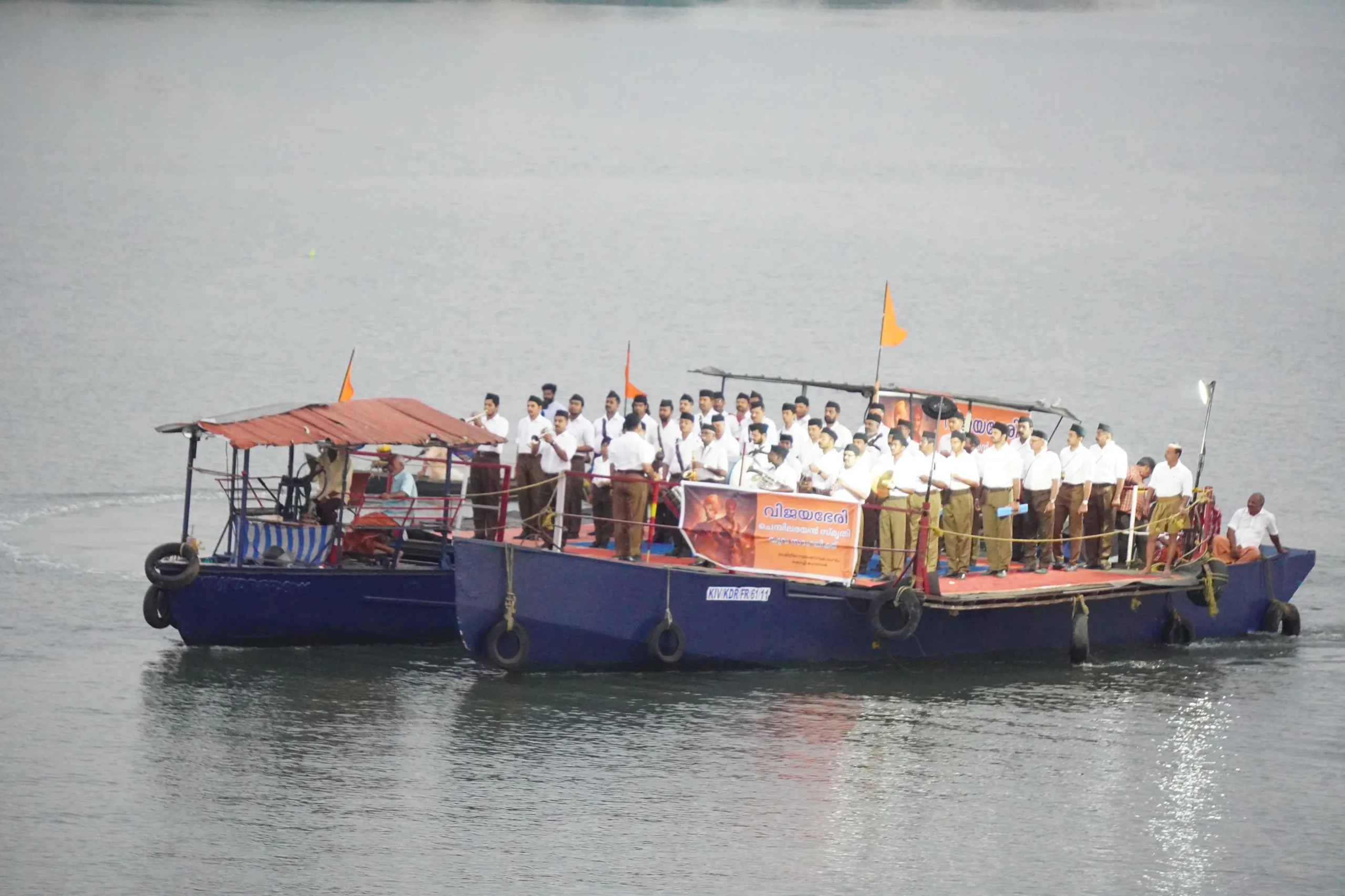 കൊച്ചി: ഐതിഹാസികമായ ബോള്ഗാട്ടി യുദ്ധവിജയത്തിന്റെ സ്മരണകളുണര്ത്തിആര്എസ്എസ് പ്രവര്ത്തകര് കൊച്ചി കായലില് വിജയഭേരി ഘോഷ്പ്രദര്ശനംനടത്തി. ആര്എസ്എസ് ശതാബ്ദി യുവകാര്യക്രമങ്ങളുടെ മുന്നൊരുക്കമായി കൊച്ചിമഹാനഗരത്തില് സംഘടിപ്പിച്ച വിവേകാനന്ദജയന്തി യുവസാംഘിക്കിന്റെ ഭാഗമായാണ്ചെമ്പിലരയന് അനുസ്മരണ ഘോഷ് പ്രദര്ശനം നടന്നത്.