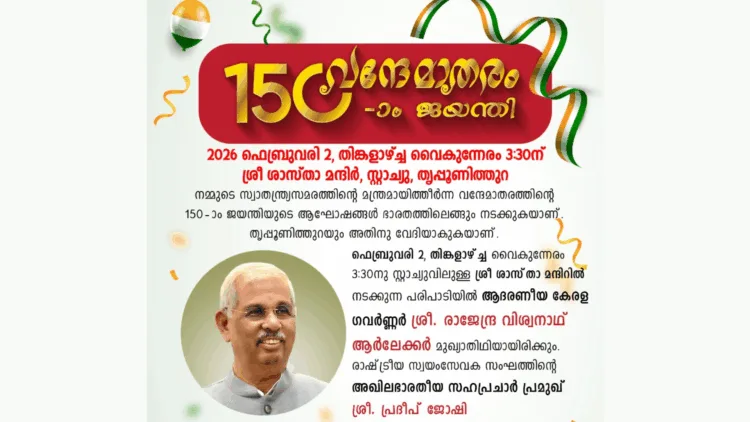 കൊച്ചി : വന്ദേമാതരം എന്ന ദേശീയ ഗാനത്തിൻ്റെ 150-ാം വാർഷിക ആഘോഷത്തിനായി സ്വാഗത സംഘം രൂപീകരിച്ചു. തപസ്യ, ഭാരത് വികാസ് പരിഷത്, ഭാരതീയ വിചാരകേന്ദ്രം, ബാലഗോകുലം എന്നീ സംഘടനകളുടെ ആഭിമുഖ്യത്തിൽ വന്ദേമാതരം സാർദ്ധശതി ആഘോഷ സമിതി എന്ന പേരിലാണ് ഇതറിയപ്പെടുന്നത്. 2026 ജനുവരി 30 മുതൽ ഫെബ്രുവരി 2 വരെയാണ് ആഘോഷ പരിപാടികൾ. തൃപ്പൂണിത്തുറ നഗരസഭാ അദ്ധ്യക്ഷൻ അഡ്വ. പി.എൽ. ബാബു, ഉപാദ്ധ്യക്ഷ രാധിക വർമ്മ, എൽ.ആർ.പോറ്റി എന്നിവർ രക്ഷാധികാരിമാരും എം.ആർ.എസ്. മേനോൻ അദ്ധ്യക്ഷനും ഡോ. ശിവശങ്കരൻ, രാജലക്ഷ്മി, എം.ഡി. ജയന്തൻ നമ്പൂതിരിപ്പാട്, എന്നിവർ ഉപാദ്ധ്യക്ഷന്മാരും മോഹൻ കുമാർ കെ. പൊതു കാര്യദർശിയും സതീശ് ബാബു, മനോജ് മോഹൻ എന്നിവർ സഹകാര്യദർശിമാരുമാണ്. കൃഷ്ണനാഥ് വെങ്കടരാമൻ ഖജാൻജിയും വിവേകാനന്ദൻ സഹഖജാൻജിയുമാണ്. പരിപാടികളുടെ സംയോജകനായി അഡ്വ.രഞ്ജിനി സുരേഷായിരിക്കും.