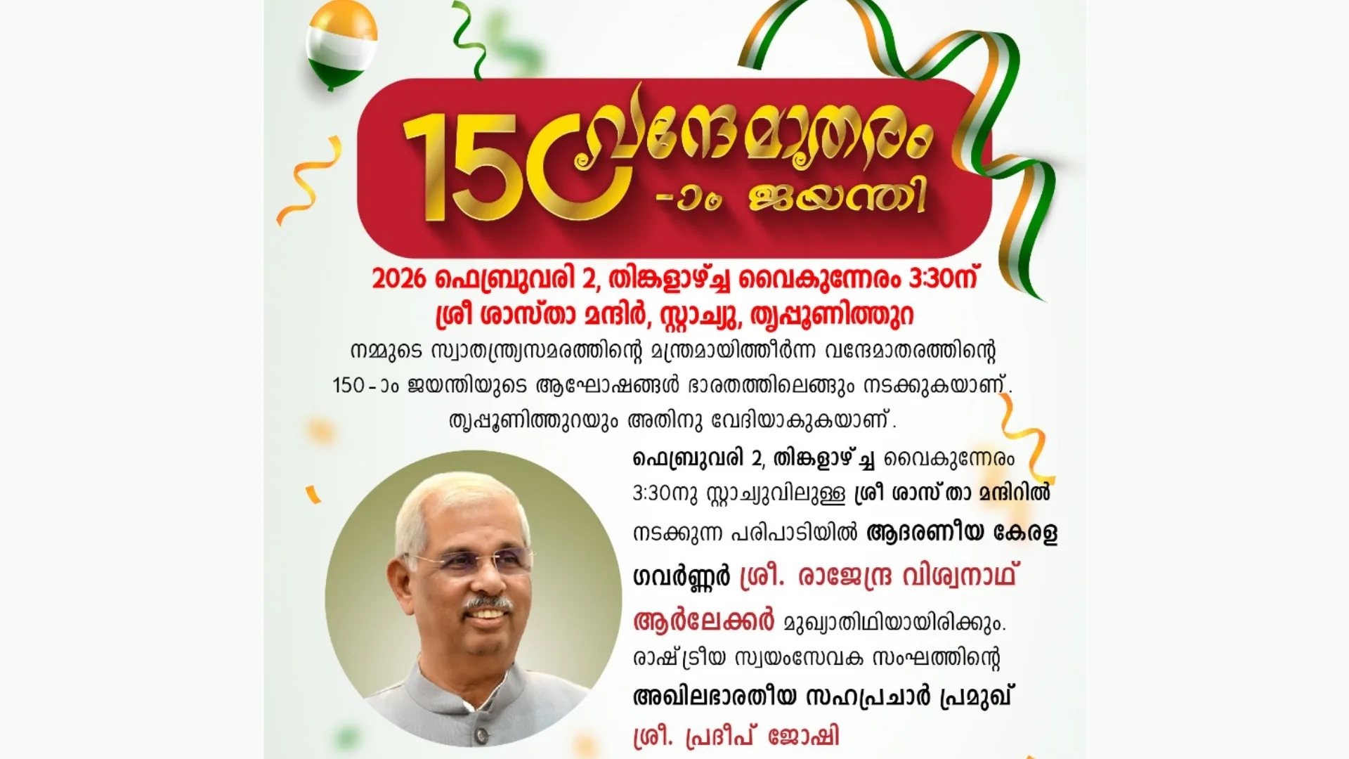 ഫെബ്രുവരി 2 ന് തൃപ്പൂണിത്തുറ സ്റ്റാച്ച്യുവിലുള്ള ശ്രീ ശാസ്താ മന്ദിറിൽ നടക്കുന്ന ആഘോഷ പരിപാടിയിൽ ബഹു. കേരള ഗവർണർ രാജേന്ദ്ര വിശ്വനാഥ് ആർലേക്കർ മുഖ്യാതിഥിയായിരിക്കും. രാഷ്ട്രീയ സ്വയംസേവക സംഘത്തിൻ്റെ അഖില ഭാരതീയ സഹപ്രചാർ പ്രമുഖ് പ്രദീപ് ജോഷി പ്രഭാഷണം നടത്തുന്നതാണ്.