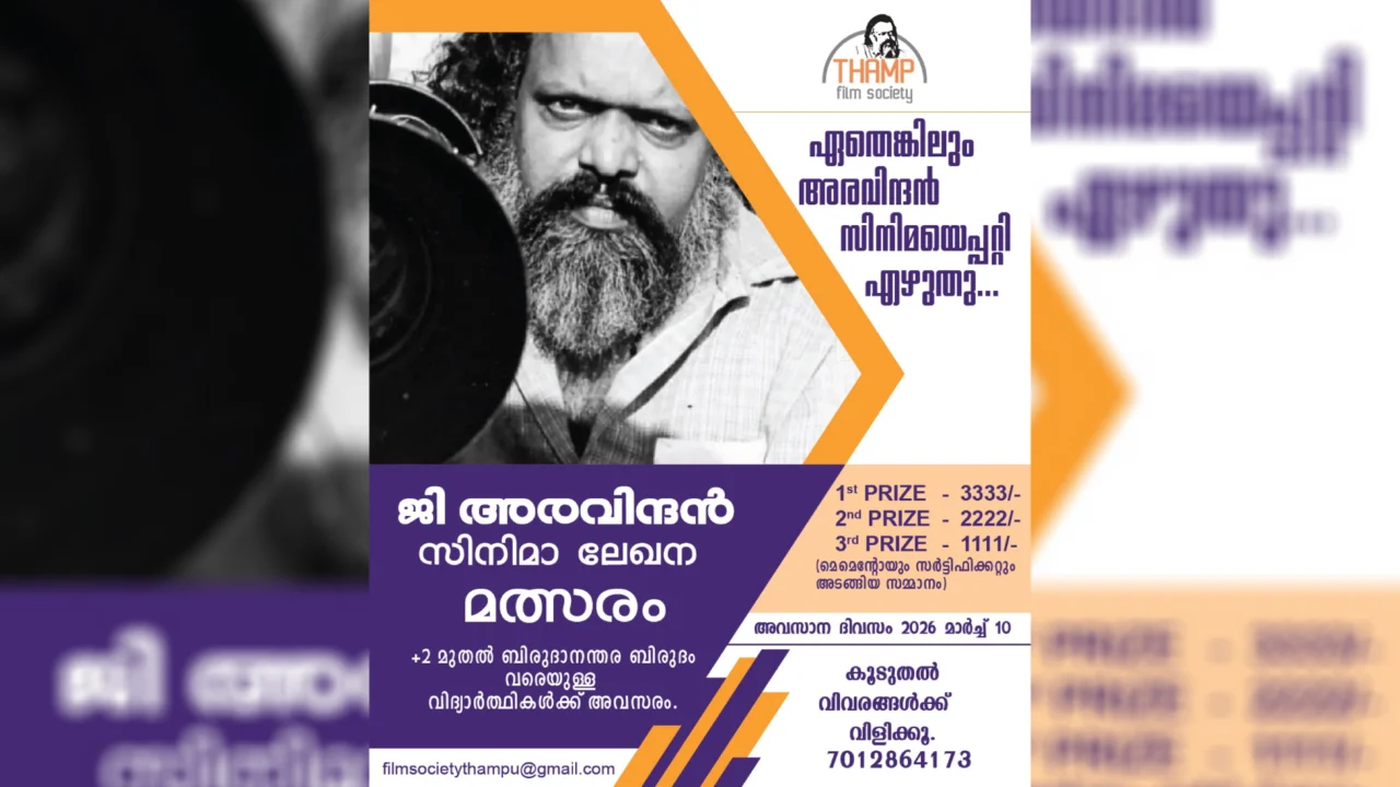 കോട്ടയം: തമ്പ് ഫിലിം സൊസൈറ്റിയുടെ ആഭിമുഖ്യത്തിൽ പ്രശസ്ത സംവിധായകൻ ജി. അരവിന്ദൻ്റെ സ്മൃതി ദിനത്തിനോട് അനുബന്ധിച്ച് ലേഖന രചനാ മത്സരം സംഘടിപ്പിക്കുന്നു.