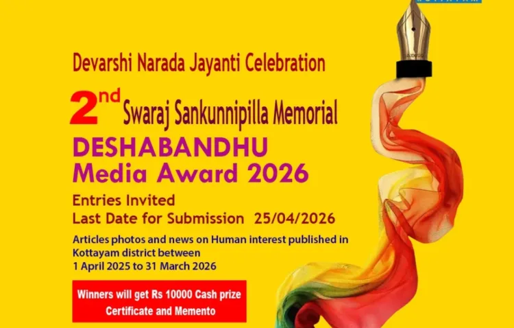 കോട്ടയം: വിശ്വസംവാദകേന്ദ്രം കോട്ടയം യൂണിറ്റിൻ്റെ നേതൃത്വത്തിൽ സംഘടിപ്പിച്ചിരിക്കുന്ന ഈ വർഷത്തെ നാരദ ജയന്തി മാധ്യമപുരസ്കാരത്തിന് (2025-2026) അപേക്ഷകൾ ക്ഷണിക്കുന്നു. വിഷയം : മാനുഷിക താല്പര്യം മുൻനിർത്തിയുള്ള മികച്ച സ്റ്റോറി / റിപ്പോർട്ട്.
